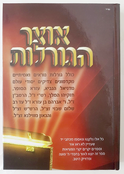 ספר "אוצר הגורלות" כולל גורלות נוראים ואמיתיים מקדמונים צדיקים יסודי עולם מדניאל הנביא, עזרא הסופר, חזקיהו המלך, רש"י, הרמב"ן, ר' אברהם אבן עזרא, עד הרב שלום שבזי זצוק"ל הרש"ש זצוק"ל והגר"א מוילנא זצוק"ל.